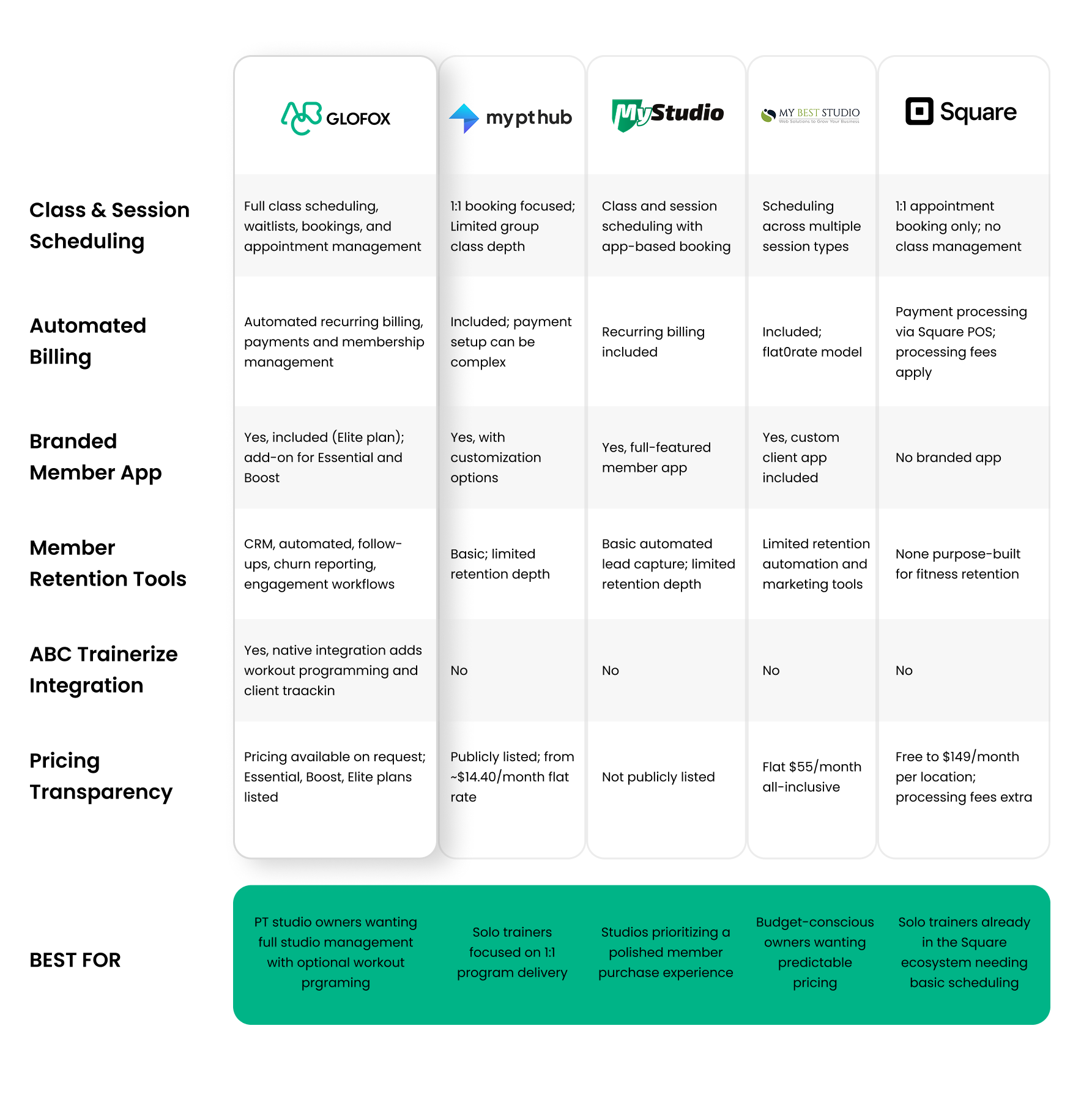 ABC Glofox is the strongest option for PT studio owners who need a full suite of services, including the optional ABC Trainerize integration for workout programming. For solo trainers focused on 1:1 coaching, My PT Hub’s flat-rate pricing is competitive. For studios prioritizing simple pricing, My Best Studio’s $55/month all-inclusive plan is worth evaluating.