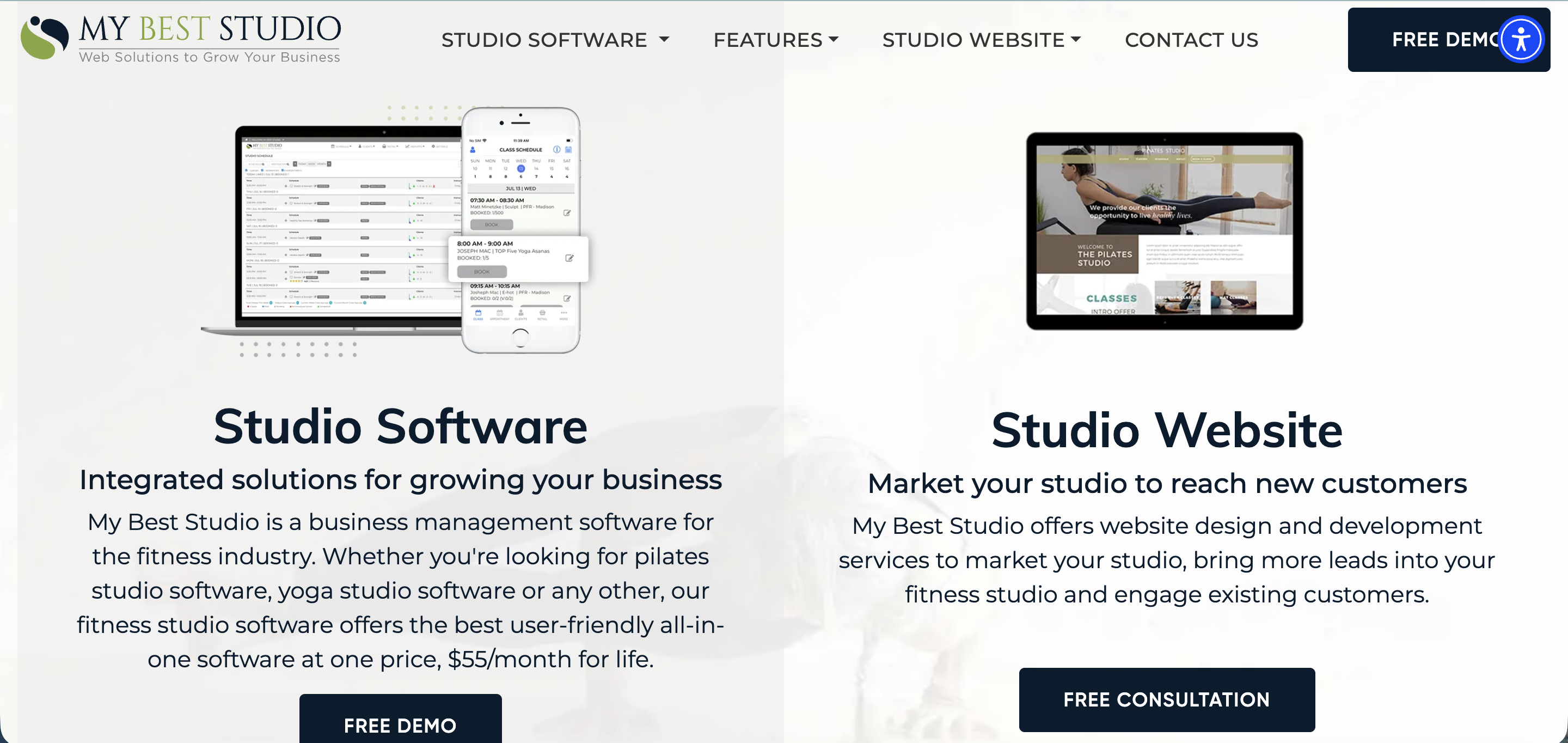 My Best Studio offers flat-rate personal trainer studio management software at $55/month, all-inclusive. It covers scheduling across session types, billing, attendance tracking, staff management, and a custom client app. It’s less developed on retention and marketing tools compared to other platforms on this list.