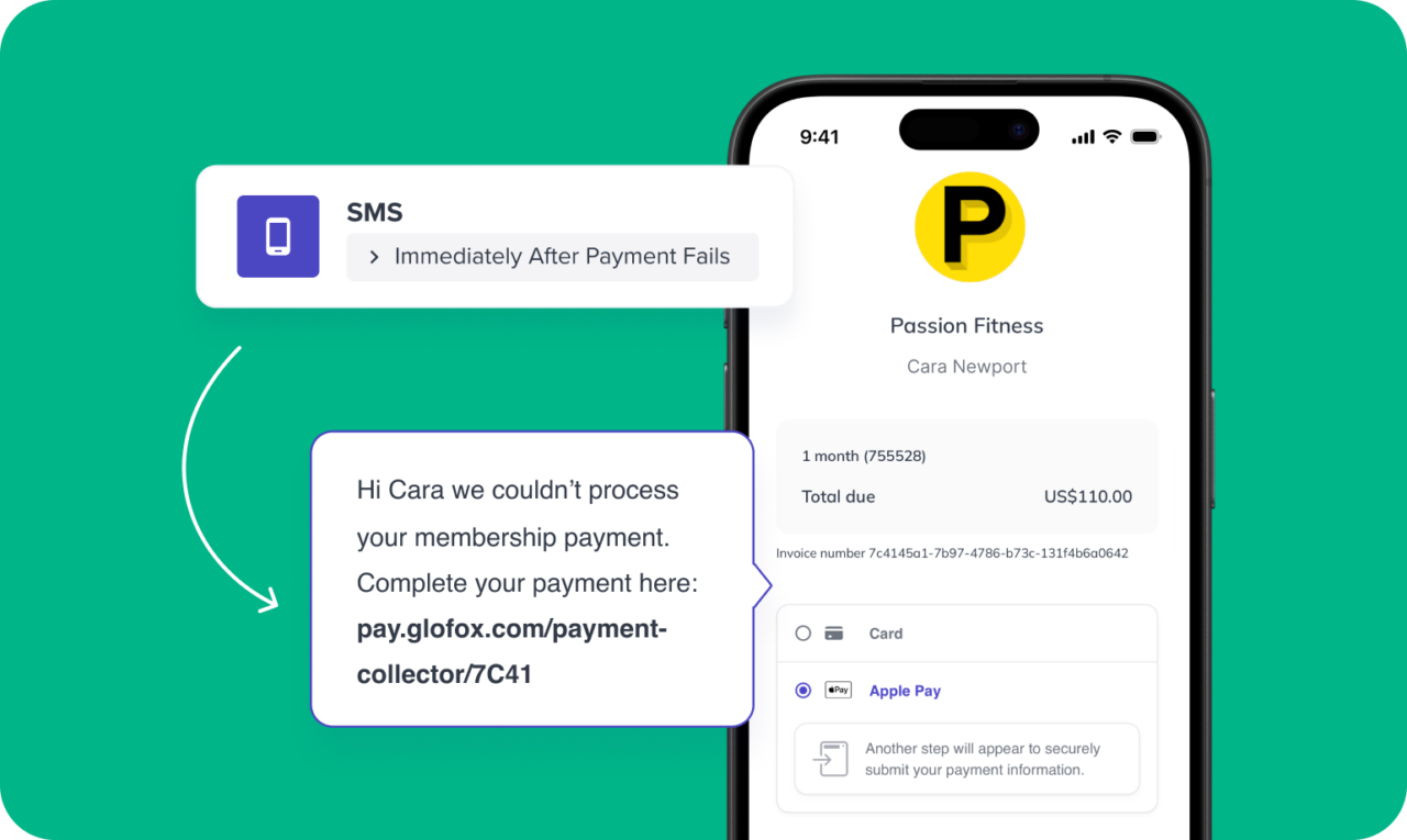 When a payment fails, a link can now be automatically sent via email or SMS, allowing members to pay instantly using card, Apple Pay, or Google Pay. Staff can also generate links manually and share them through any channel.