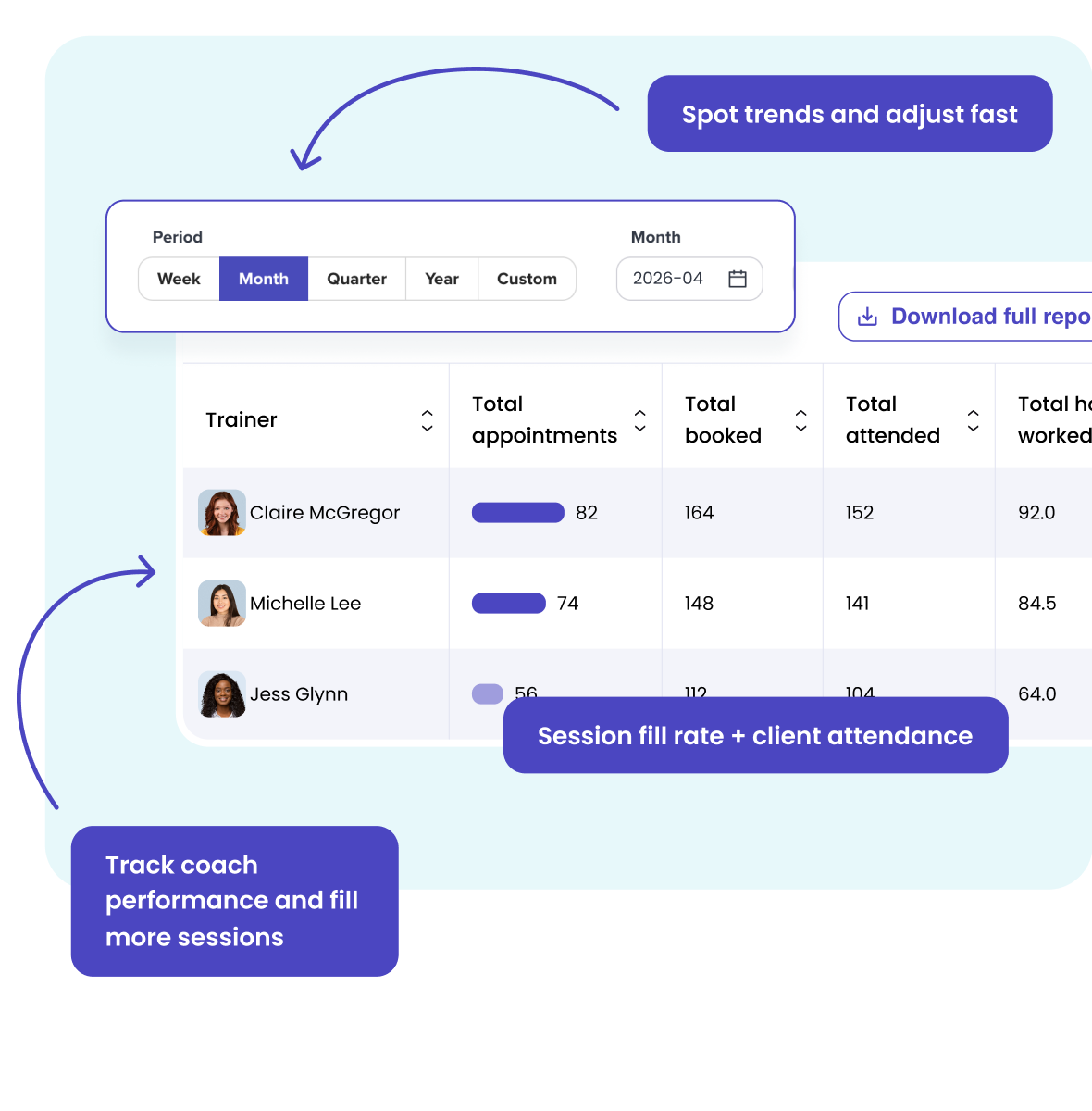 Track performance across sessions, trainers, and revenue to optimize your schedule, improve retention, and grow your business.